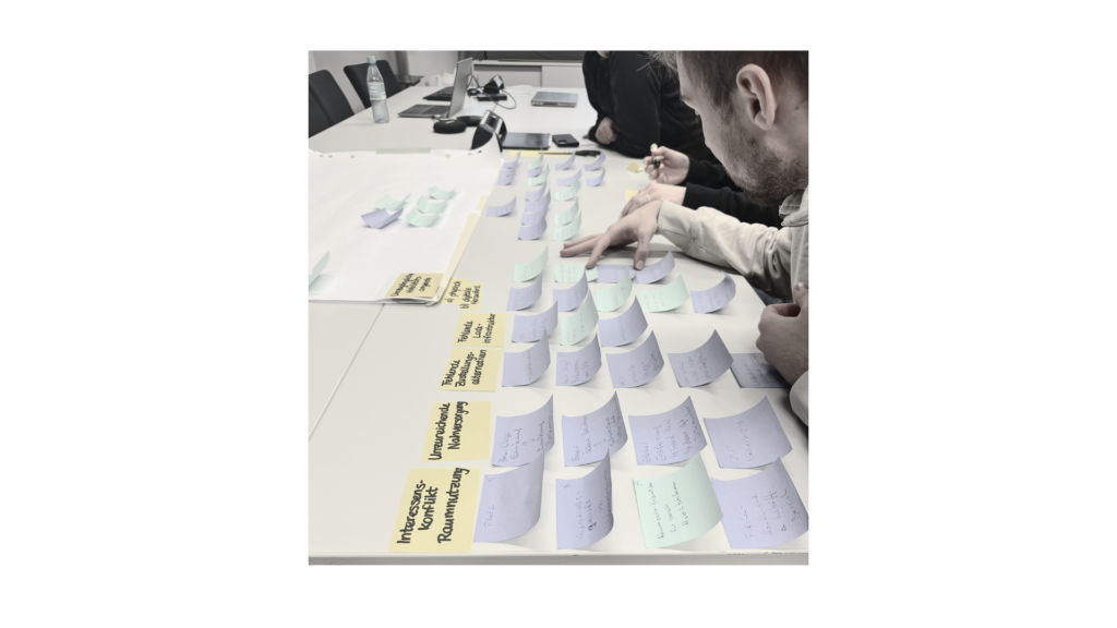 Aus dem Kick-off mit den Bewohner*innen, den Gesprächen im Quartier und unseren und unserem Lego® Serious Play-Workshop entstand ein umfassendes Bild der Perspektiven der Anwohnenden und Stakeholdern. Dabei wurde deutlich, wie vielfältig ihre Erfahrungen und Bedürfnisse sind und welche Rolle alltägliche Routinen bei Themen wie Mobilität, Energie, Wohnen oder Mülltrennung spielen, und welche Konfliktpotenziale bestehen.